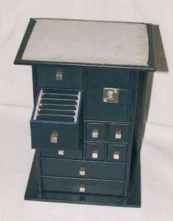 Here you can see the bare board, covered in leather, and one of the earring drawers. For earrings, I created a sort of 'suspension file' system, with leather tabs on mahogany hangers, with holes punched in the tabs, through which Mum could hang her earrings. Worked like a treat!